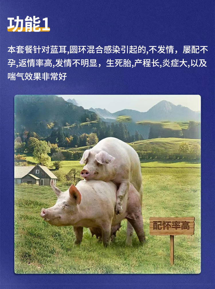 產品簡介:針對藍耳、圓環混合感染引起的不發情、屢配不孕、返情率高、發情不明顯、生死胎、產程長、炎癥大以及喘氣、消瘦、拉稀、便秘、效果好!