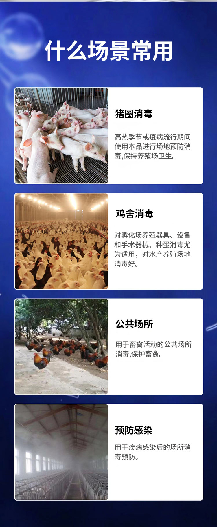 2適用于家畜口蹄疫、藍耳病、烈性、溫和性豬瘟、圓環(huán)病毒、藍耳病、弓形體、附紅細胞體、鏈球菌、傳染性胃腸炎、流行性瀉痢及無名癥的傳染性高熱病等病毒性、細菌性疾病的消毒預防。