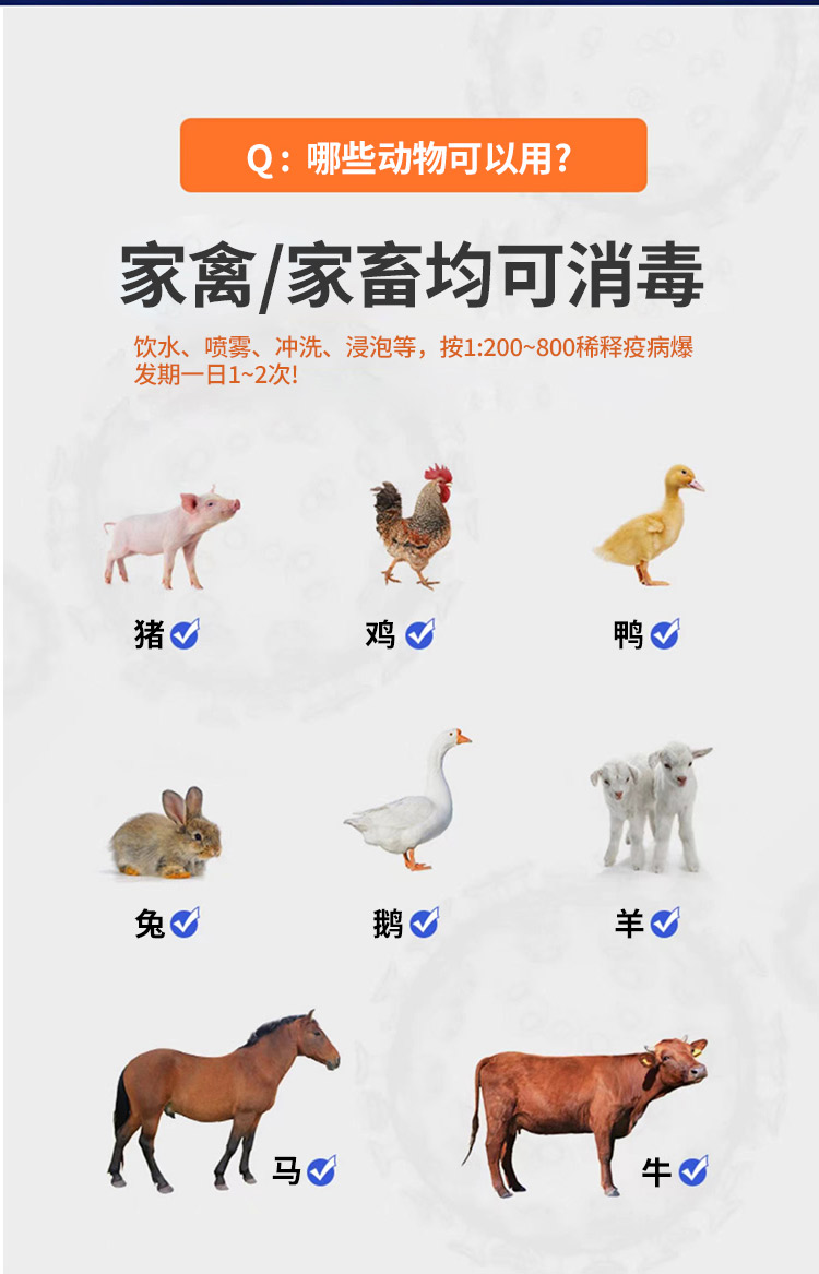 【用法用量】飲水、噴霧、沖洗、浸泡等,按1:200-800稀釋詳見標簽說明書,疫病暴發(fā)期一日1-2次