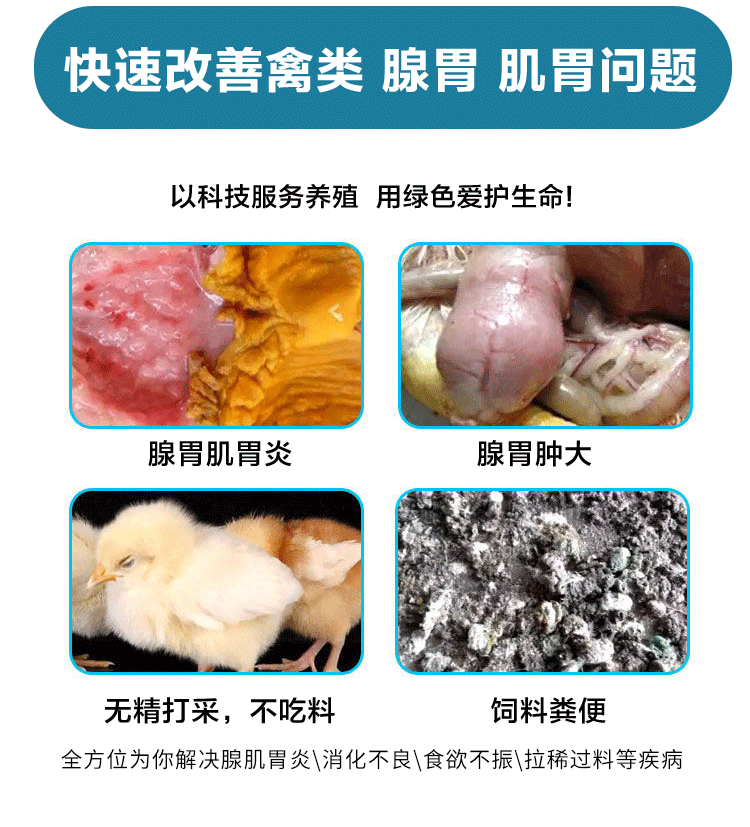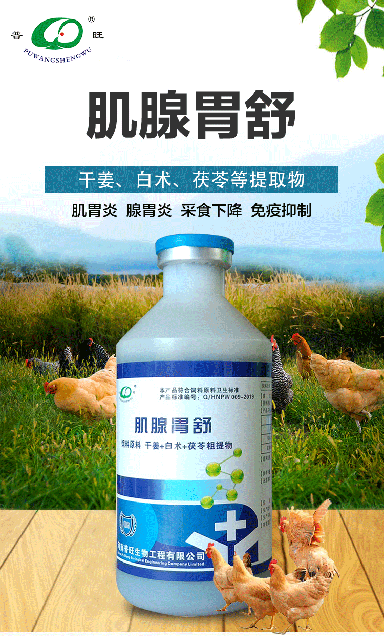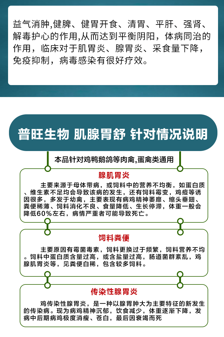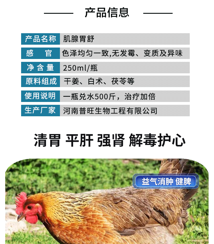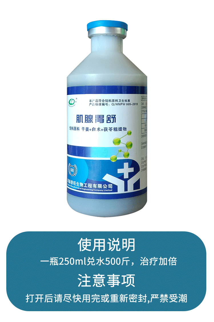 【適用范圍】益氣消腫,健脾、健胃開食、清胃、平肝、強腎、解毒護心的作用,從而達到平衡陰陽,體病同治的作用,臨床對于肌胃炎、腺胃炎、采食量下降,免疫抑制,病毒感染有很好療效。