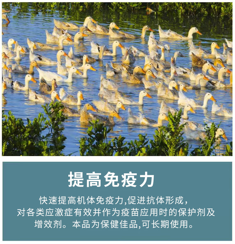 【適 應 癥】主要用于抗病毒,提高機體免疫力、新城疫、法氏囊、喉氣管炎等疾病有防治作用。